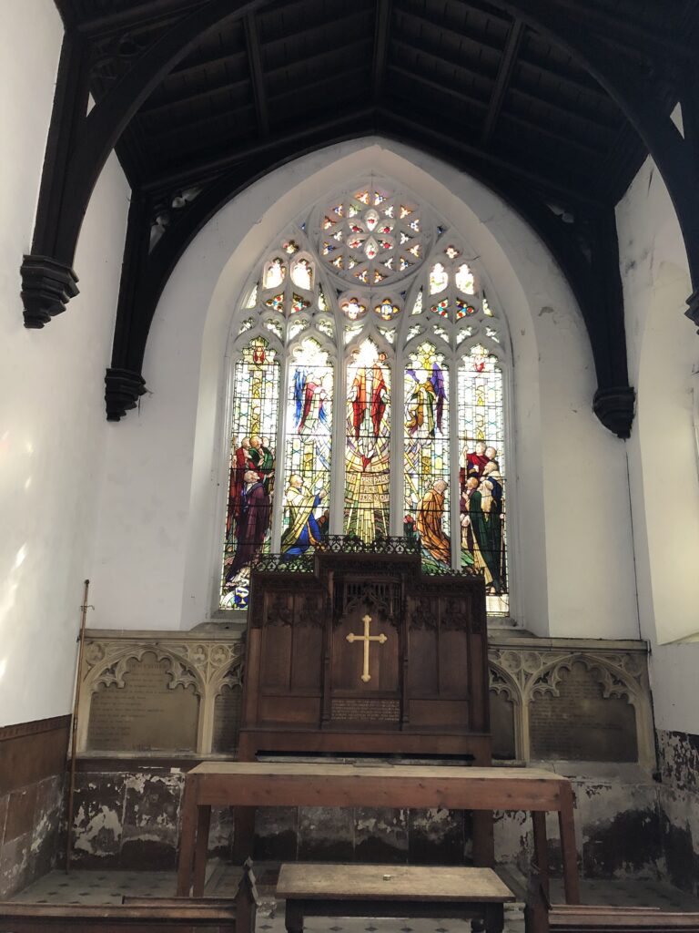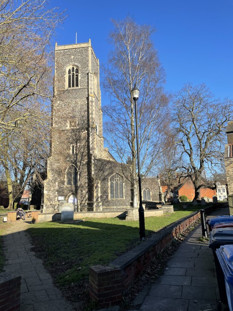 The fifteenth century clerestory has single two-light windows set in a wall of flint and freestone-flushwork niches and pinnacles. Inside, look for the fine 15th century font, near which is the headstone of Thomas Cobbold, who brought his brewery from Harwich and used water from the fine springs in Holywells Park, (Ipswich, Suffolk) a warning on an amusing stone let into the wall of the south aisle, and several fine mural monuments in the chancel.