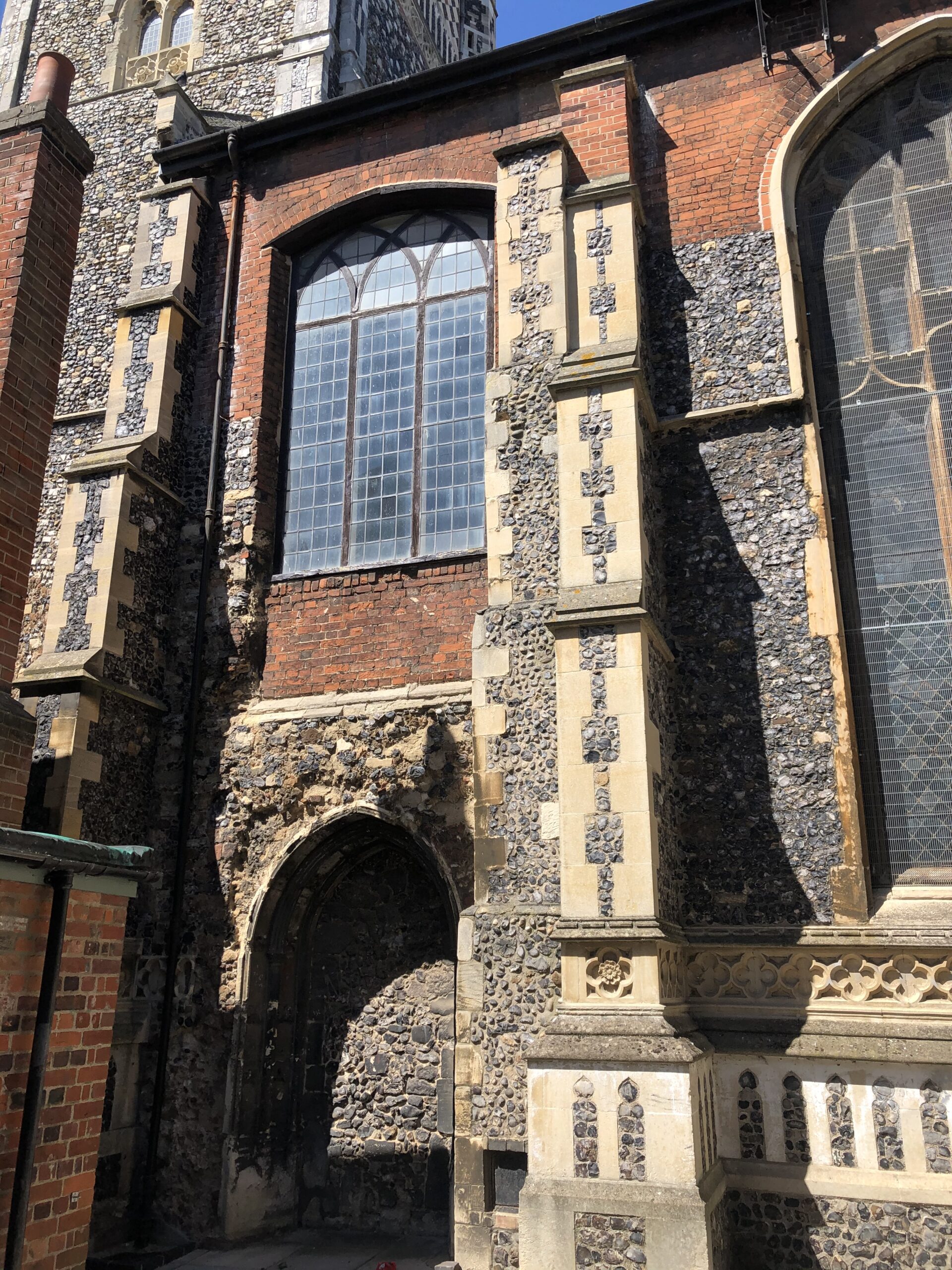 The decorative tower we are familiar with is a result of extensive adaptions and decorations added during the nineteenth century, unfortunately some of the stonework and flint facing has not lasted as well as might be expected. Repairs have commenced which are due to complete in spring 2026.